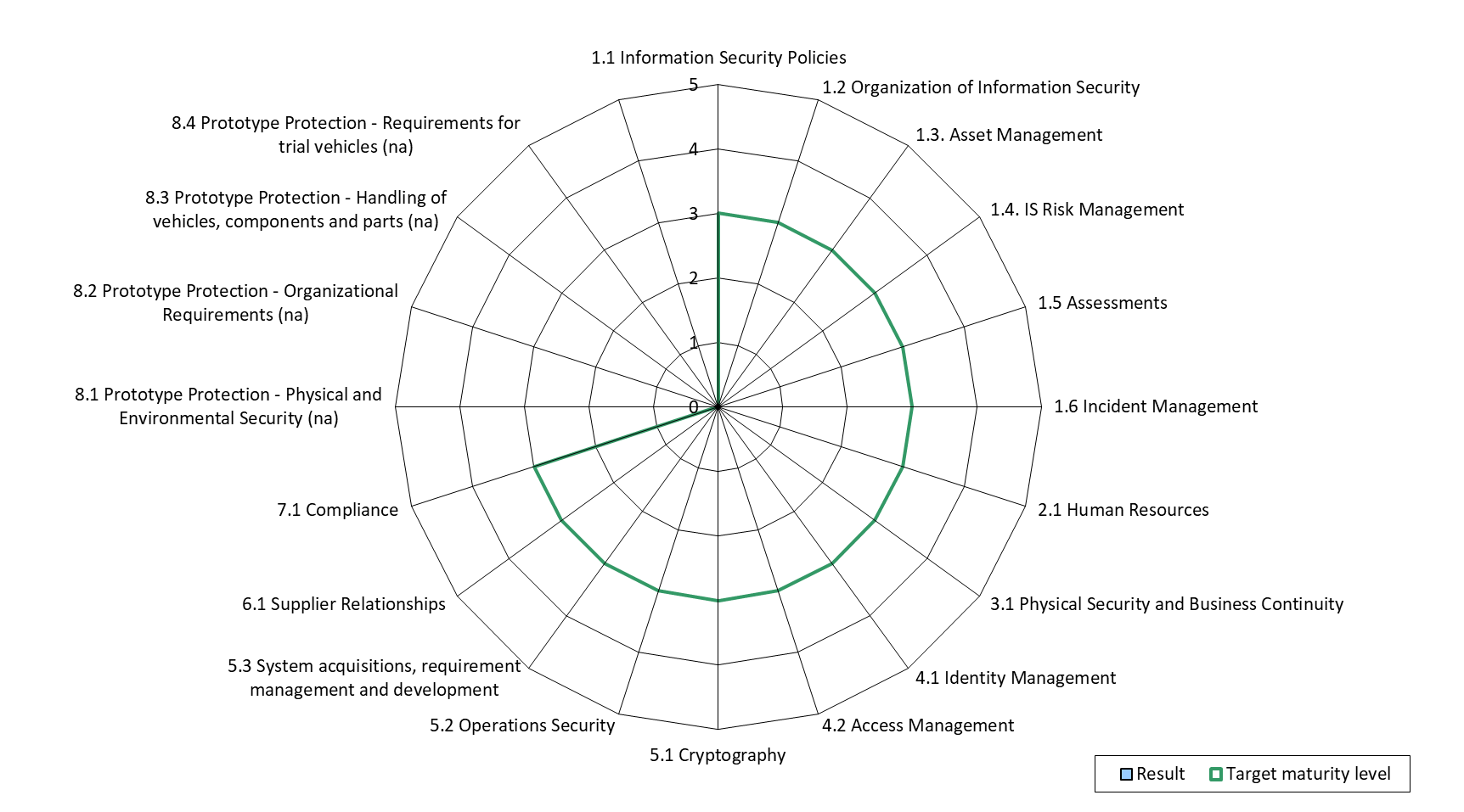 TISAX5.1从信息安全ISO27001:2013 的基础上进行了扩展,包括通用信息安全和原型保护、数据安全三个域,在实施措施上比较具体和明确。最后通过雷达图对67项进行打分。